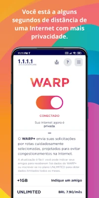 A simplicidade é a chave do 1.1.1.1 com WARP. Com uma configuração intuitiva e sem complicações, você desfruta de uma internet mais segura e privada em questão de momentos, sem precisar de conhecimentos técnicos. E para aqueles que buscam a máxima performance, o WARP+ eleva sua experiência a um novo patamar. Esta funcionalidade premium inteligentemente escaneia milhares de rotas na internet a cada segundo para identificar o caminho mais rápido, desviando de gargalos e congestionamentos para entregar uma velocidade de navegação otimizada. Embora o 1.1.1.1 com WARP seja gratuito, o WARP+ é um serviço opcional por assinatura, oferecendo dados ilimitados para uma experiência digital sem precedentes.