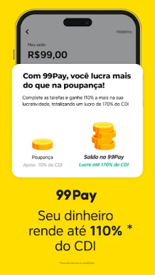 Vá além da mobilidade e descubra as vantagens exclusivas que a 99 oferece. Com o Clube99, você tem acesso a cupons de desconto que tornam suas viagens ainda mais acessíveis. E para uma gestão financeira descomplicada, a 99Pay, nossa conta digital integrada, transforma seu dinheiro em um ativo, rendendo até 110% do CDI diariamente, inclusive em feriados. Realize pagamentos via PIX, quite boletos, recarregue seu celular, explore o universo das criptomoedas, receba cashback em suas corridas e, se precisar, avalie as opções de empréstimos pessoais disponíveis através da plataforma, com condições flexíveis e transparentes. A 99Pay atua como correspondente bancário de instituições parceiras, sempre com a máxima segurança e conforme as normativas do Banco Central.