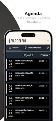 Com MINISTÉRIO FILADÉLFIA, a gestão de Grupos de Crescimento (GCs), Escolas e Ministérios torna-se intuitiva e eficiente. Encontre facilmente um GC perto de você ou, se já faz parte, utilize as ferramentas robustas para liderar: indique novos participantes, registre presenças, preencha relatórios de encontros, visualize o endereço do próximo evento e envie notificações instantâneas aos membros. É a ferramenta essencial para organizar e acompanhar o desenvolvimento de cada grupo, garantindo que ninguém fique de fora.